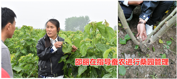 邵麗負(fù)責(zé)周邊200多戶蠶農(nóng)的養(yǎng)蠶技術(shù)指導(dǎo)工作,這其中有年近八旬的蠶農(nóng)小戶,也有年富力強(qiáng)的養(yǎng)蠶大戶。由于有些蠶農(nóng)年齡大,理解接收能力弱,養(yǎng)蠶的技術(shù)容易發(fā)生偏差,邵麗就重點(diǎn)到這些農(nóng)戶家的蠶室查看。耿棚鎮(zhèn)淮北村位于基地北側(cè),這里坐落著許莊、蔣莊、小郭莊、黃莊等數(shù)個(gè)村莊,邵麗沿著既定的巡線線路,盡量挨家挨戶走訪,準(zhǔn)確了解每一位蠶農(nóng)家養(yǎng)蠶的進(jìn)度。上午她來到劉炳翠家,看到她在自家的臥室里養(yǎng)蠶,雖然該臥室暫未住人,但邵麗還是反復(fù)提醒劉炳翠,要建專門的小蠶共育室,定期消毒預(yù)防病害。此外,蠶進(jìn)入三齡以后,需要大量進(jìn)食桑葉,而且進(jìn)食速度加快,此時(shí)可以把桑葉切成大片投喂?吹絼⒈溥把桑葉切成細(xì)條形狀,邵麗連忙拿起一把桑葉親自給她示范,臨走時(shí)不斷強(qiáng)調(diào):“家中一定不能點(diǎn)蚊香,下地打農(nóng)藥回來要洗澡換衣服后再進(jìn)蠶室,以防蠶中毒死亡!泵康揭患,邵麗都仔細(xì)查看蠶的長勢、蠶箔內(nèi)蠶的疏密狀況,提醒蠶農(nóng)注意保溫保濕,定時(shí)開窗通風(fēng),并且反復(fù)叮囑三齡蠶投喂三眼葉的時(shí)候,一定要先拿一部分桑葉做實(shí)驗(yàn),如果蠶吃后沒有出現(xiàn)中毒現(xiàn)象,才可以繼續(xù)大量喂食。