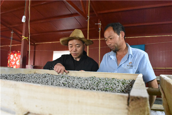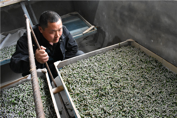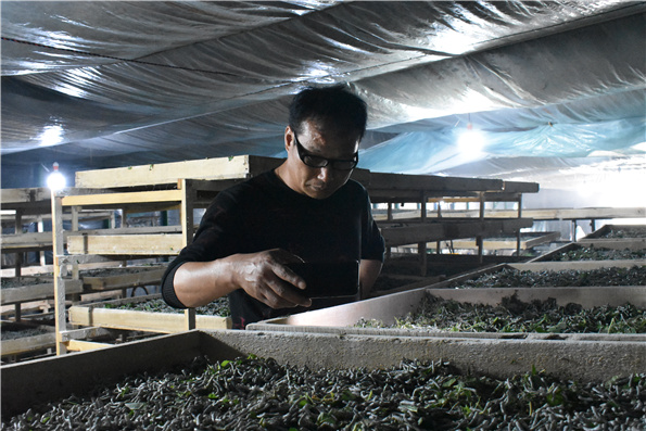 劉國軍2000年前后進(jìn)入公司,最開始做綢緞銷售工作,后來在繅絲車間當(dāng)過機(jī)修工,再后來加入蠶桑辦,全身心投入到公司的栽桑養(yǎng)蠶事業(yè)中。最近,他經(jīng)常來到盧有志家中,這位蠶農(nóng)已經(jīng)74歲高齡,前段時(shí)間因?yàn)槭杪,屋?nèi)進(jìn)了老鼠,蠶室內(nèi)的蠶被老鼠吃去大半。養(yǎng)了十多年蠶的盧老漢并未灰心,他趕緊找到劉國軍,又補(bǔ)了半張蠶種。劉國軍這次來就是來看看后補(bǔ)的這些蠶長勢如何,每次來他都一遍遍提醒:農(nóng)藥桶遠(yuǎn)離蠶室,小蠶注意保暖加濕,大蠶注意通風(fēng)稀放,臨走時(shí),還會(huì)幫忙仔細(xì)檢查門窗縫隙是否密封牢固,防止老鼠再次侵?jǐn)_。劉國軍說:“老人年紀(jì)大了,養(yǎng)蠶技術(shù)記不住,就需要一遍一遍的講,他們腿腳不方便,我每次去能幫忙做的就多搭把手,畢竟盧家老兩口養(yǎng)了好多年蠶,不能辜負(fù)了對咱的信任。而且他們是低保戶,通過養(yǎng)蠶一年兩季能掙到好幾千塊錢,我操點(diǎn)心多盯著,不想讓他們辛苦一季顆粒無收!”