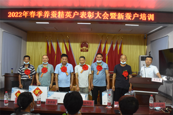 孟憲麗主任宣讀2022年春季養(yǎng)蠶精英戶獲獎名單。隨后,與會領導為獲獎者頒發(fā)“華詩雅蒂”蠶絲被等獎品并合影留念。
