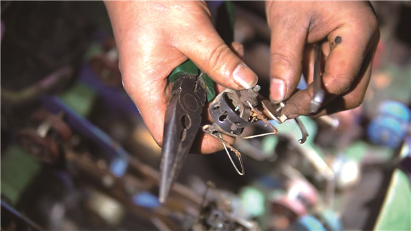 說起更換探索片,這里面還有個(gè)小插曲。公司去年初更換了兩組繅絲機(jī),舊繅絲機(jī)拆下來后,便被丟進(jìn)倉庫。買過家電的人都知道,買的時(shí)候貴,用過之后再賣就賣不上價(jià)了,這些舊機(jī)器也一樣,丟進(jìn)倉庫最終只能當(dāng)做廢品賣。為了節(jié)約機(jī)物料消耗,劉陽最近一段時(shí)間一有空,便一手提塑料桶,一手拿著手電,領(lǐng)著自己剛收的學(xué)員一股腦的鉆進(jìn)倉庫,在廢舊、陰暗、狹窄的舊機(jī)器堆中尋找,尋找那些能用的,還沒有磨損至報(bào)廢的零部件,比如,最近他就重點(diǎn)在找能用的探索片。劉陽說,“別看是從舊機(jī)器上拆下來的,這還管用哩,要是買新的,得五塊錢一個(gè)呢!”說著說著,他已經(jīng)用鉗子把探索片擰了下來。一個(gè)、兩個(gè)、三個(gè)……不到半小時(shí),他跟學(xué)員一起便收集到四五十個(gè)能用的探索片。我問劉陽:“你來這倉庫幾次了?”他笑道:“來N次了!這里都快讓我卸完了!边@邊忙著,那邊還操著車間的心,劉陽看時(shí)間差不多了,打趣得跟我說:“今天撿垃圾就撿到這吧,車間機(jī)器估計(jì)該開了,咱得趕緊回去。”