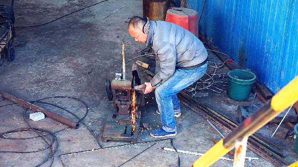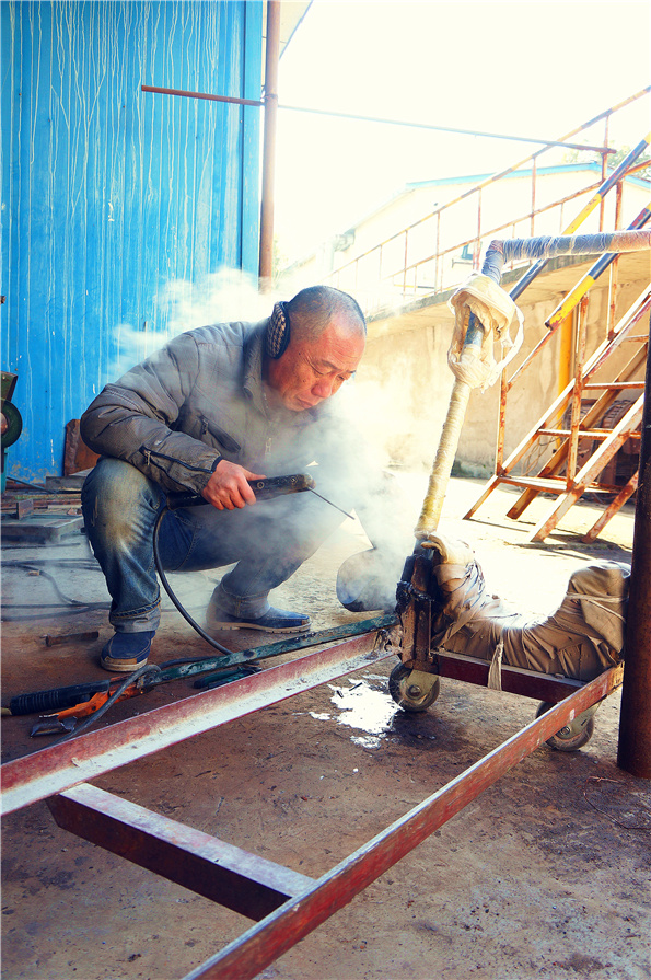 緊鄰汰頭廢水處理池旁的工棚——公司專門焊接的地方迎來一位男子,他剛把從車間推來的小車放好,便打開電焊機,時而彎腰把焊條對準焊點打出火花,時而蹲下仔細查看焊接點的牢固程度,在四面漏風的工棚里干得熱火朝天。這位男士便是蘭恒亮師傅,只用了一會功夫,他就把這輛剛剛推來的小車扶手處焊接得緊實牢靠。
