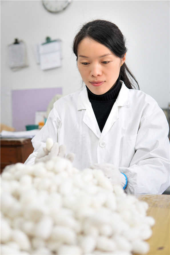 葉曉燕:我發(fā)現(xiàn),擋車工擋車的時候多余動作比較多。其實,繅絲是有方法的,同樣的莊口、車速,同樣的機器,看臺效果卻不同,有些人工作比較輕松而且三項指標還好,而有的人慌得手忙腳亂,結果還經常出質量問題,這就是區(qū)別。要想繅出高品位生絲,就要在每一縷絲從手中劃過的時候用心體會,感受它的力度、方向和韌勁,從而改掉不良操作的習慣,做到忙中不亂,先易后難。我們員工不僅需要精湛的技術,還需要認真工作的態(tài)度和追求完美的工作精神。