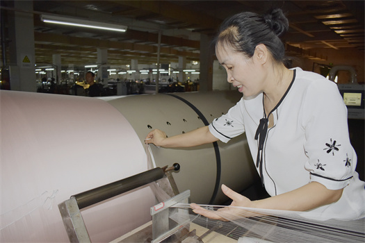 在牽經(jīng)組,丁敏始終保持著一種自發(fā)的高度的責(zé)任心。這份擔(dān)當(dāng)源于公司對她的信任和培養(yǎng);源于同事和領(lǐng)導(dǎo)的關(guān)心;更來源于她對這項(xiàng)工作的無限熱愛。從首次接觸智能整經(jīng)機(jī)到獨(dú)立操作、熟練使用,丁敏通過多次學(xué)習(xí)鉆研,克服了重重阻礙,摸索出了一套行之有效的技巧方法,在牽經(jīng)工這個崗位上生根發(fā)芽,枝繁葉茂。丁敏說:“感謝公司當(dāng)年對我的信任和栽培,把牽經(jīng)技術(shù)的重大革新任務(wù)交給我,并一點(diǎn)一點(diǎn)把我培養(yǎng)為這個專業(yè)的能手,所以我沒有任何理由不把車間的牽經(jīng)工作做好!”