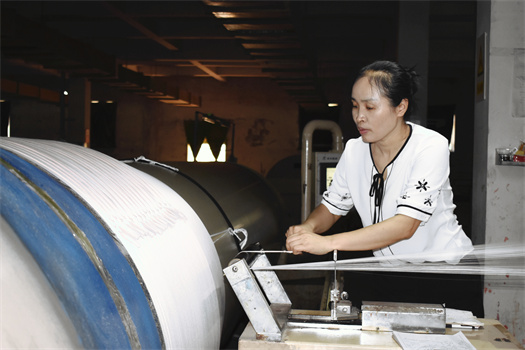 丁敏的步子很快,沒幾步就能從人群里冒出來。她和藹可親,聊天中始終保持著笑容;她謙遜恭謹(jǐn),“謝謝”二字常掛在嘴邊;她細(xì)致耐心,十年前的事情也不忘把細(xì)節(jié)回憶得一清二楚,她是準(zhǔn)備車間的一名牽經(jīng)工,常年工作都是在和480只絲線筒子連接著的牽經(jīng)中度過的。