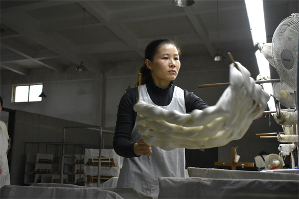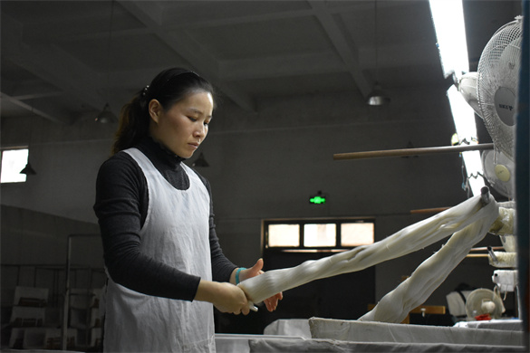 復整車間的整理室里,劉偉偉穿著白色工服,在忙碌的工作間隙接受采訪。她正在打絞,一會還要把打好絞的白廠絲打包、分類、裝包。和往日一樣,她早上7點多就來到車間,中午不休息,一直要忙到下午4點,一天的工作才算結(jié)束。