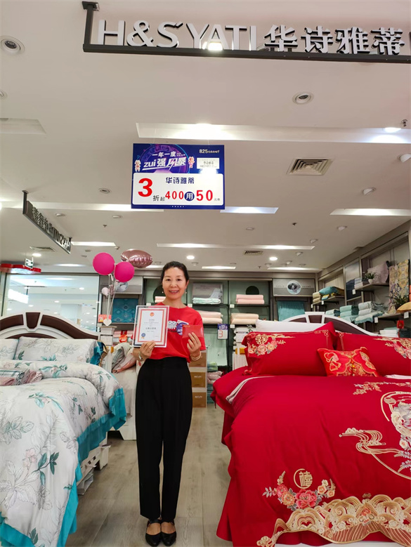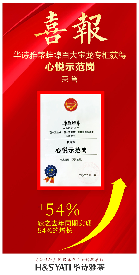 在蚌埠百貨大樓有限責(zé)任公司舉辦的2022“創(chuàng)一流企業(yè)、創(chuàng)一流服務(wù)”百日競賽活動中,“華詩雅蒂”專柜人員憑借著無私奉獻(xiàn)的奮斗精神和自我超越的工作激情,大干100天,在眾多一線家紡品牌云集的商場中,保持了良好的競爭優(yōu)勢,取得了家紡柜組連續(xù)3個月銷售排名蟬聯(lián)第一的好成績。“華詩雅蒂”專柜圓滿并超額完成百大集團(tuán)下達(dá)的銷售任務(wù),因銷售業(yè)績特別突出,被百大集團(tuán)評為“心悅示范崗”!半p創(chuàng)”成績的獲得既是對“華詩雅蒂”品牌的肯定,更是對兩位辛勤付出員工的鼓勵和鞭策。