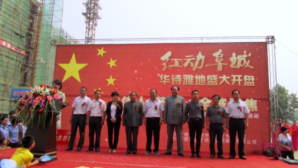 9月22日,秋高氣爽,安徽京九絲綢集團(tuán)旗下的安徽德源房地產(chǎn)開發(fā)有限公司推出的華詩(shī)雅地樓盤一期工程在萬(wàn)眾矚目中喜迎開盤盛典。是日,毛澤東、鄧小平的扮演者東方子、董曉親臨開盤現(xiàn)場(chǎng),將開盤盛典推向高潮。
