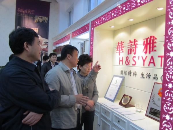 10月23日下午,中共安徽省委常委、統(tǒng)戰(zhàn)部部長(zhǎng)沈素琍在中共阜陽(yáng)市委書(shū)記、市人大主任宋衛(wèi)平等領(lǐng)導(dǎo)的陪同下蒞臨公司檢查指導(dǎo)工作,公司董事長(zhǎng)馬品德代表公司熱情接待了上級(jí)領(lǐng)導(dǎo)一行的到來(lái)。沈素琍一行深入生產(chǎn)車(chē)間一線,興致勃勃地參觀了公司的整個(gè)生產(chǎn)流程,察看了公司在繅絲與織綢上引進(jìn)的最新機(jī)械設(shè)備與新研發(fā)的產(chǎn)品生產(chǎn)情況,并饒有興致地參觀了公司的終端品牌“華詩(shī)雅蒂”產(chǎn)品展示廳。特別是在展示廳里,董事長(zhǎng)具體而生動(dòng)的介紹給隨行的各位領(lǐng)導(dǎo)對(duì)公司“華詩(shī)雅蒂”豐富多彩的系列產(chǎn)品帶來(lái)了濃厚的興趣,笑意頻頻中不時(shí)伸出手來(lái)感應(yīng)體驗(yàn)絲綢產(chǎn)品的柔順與舒適感,尤其是對(duì)運(yùn)用現(xiàn)代數(shù)碼專(zhuān)利技術(shù)與傳統(tǒng)絲織工藝結(jié)合的具有中國(guó)深厚傳統(tǒng)文化底蘊(yùn)的傳統(tǒng)文化禮品系列的精美與神韻贊不絕口。